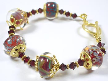 Artist-made Borosilicate (Pyrex) glass beads; deep red Swarovski crystal