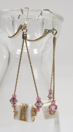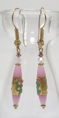 Earrings; lovely opaque rose Bohemian glass beads decorated with 24kt