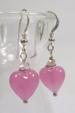 Luna Earrings; opaque rosaline handmade Venetian/ Murano glass hearts