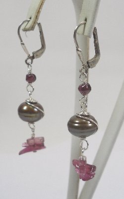 Earrings; freshwater pearls wrapped with sterling silver and rose