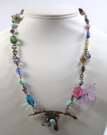 brass charms and a hand-wired brass branch, key and dragonfly charms,