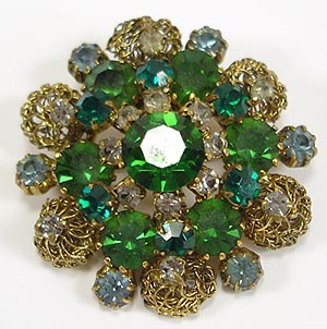 Green Crystal Brooch; approx. 1940's Bohemian crystal and filigree