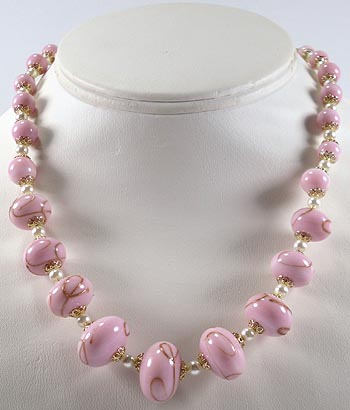 Restrung and Remodelled Rose Japanese Lampwork Bead Necklace; approx.
