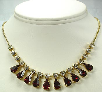 Pretty 40's Red and Clear Crystal Goldtone Drops Necklace; red is