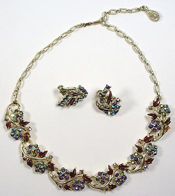 1950's Matching Necklace Clip Earrings Red Aurora Borealis Enamel Set;