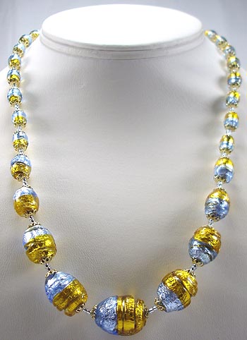 Restrung Vintage Blue-Gold Bohemian Foil Necklace; these bi-colour handmade Bohemian gold-foil beads are approx. 1940's; I added gold-plated filigree beadcaps and silverfoiled seed beads and the findings are gold-filled - I restrung the necklace using Beadalon Pro. Measures approx. 18¾ inches / 47.5 cm. £85.00 |